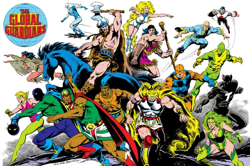 Inspirado por la Sociedad de Justicia, Dr. Mist; el Caballero y el Escudero, Percival y Cyril Sheldrake de Inglaterra; Gaucho de Argentina; El Legionario de Italia; el mosquetero de Francia; y el ala de Suecia formó los Guardianes Globales. Debutando en junio de 1982 en DC Comics presenta el #46, sus miembros provienen de todo el mundo. Por lo tanto, el nombre.
