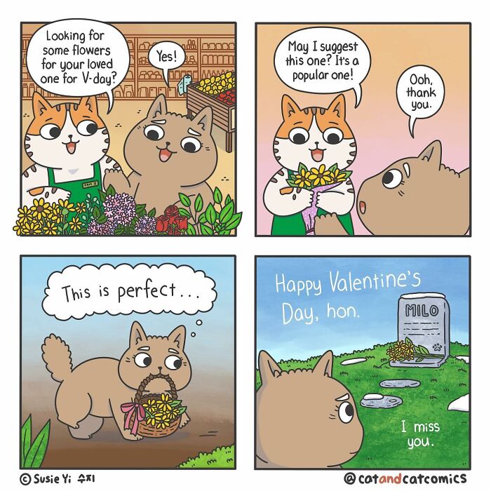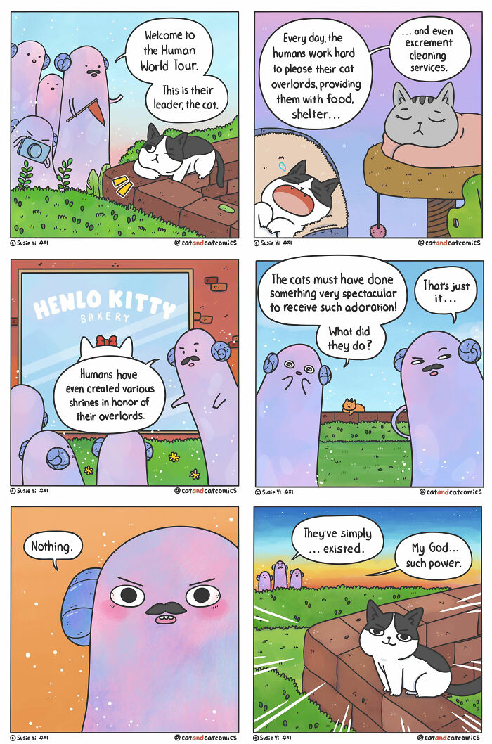 ¿Alguna vez has deseado poder entender lo que piensan o dicen tus amados gatos? Bueno, en los cómics Cat & Cat de Susie Yi, ¡ese deseo se hace realidad! El artista crea dibujos animados humorísticos que ilustran las aventuras cotidianas de los gatos y su «sirvienta humana» Suzy, que puede hablar con ellos y comprender el lenguaje felino.