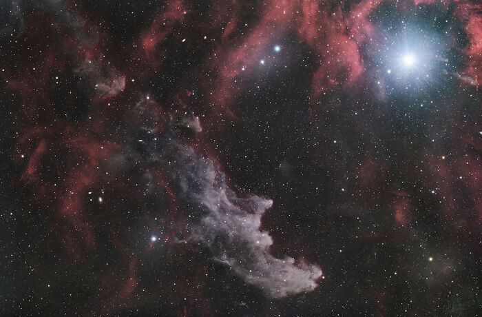 «A la luz de las estrellas, este misterioso rostro brilla en la oscuridad con un perfil torcido que evoca su nombre popular, la Nebulosa Cabeza de Bruja. De hecho, este fascinante retrato telescópico da la impresión de que una bruja ha fijado su mirada en la brillante estrella supergigante de Orión, Rigel».