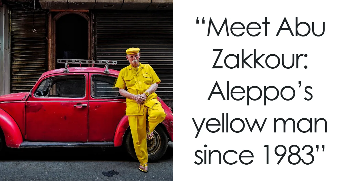 «Conozca a Abu Zakkour: el hombre amarillo de Alepo desde 1983. Durante más de 40 años, ha caminado por las calles de Alepo vestido de pies a cabeza de amarillo brillante; cada artículo que posee, desde su sombrero hasta sus zapatos, incluso su teléfono y ropa interior, irradia el mismo tono inconfundible».