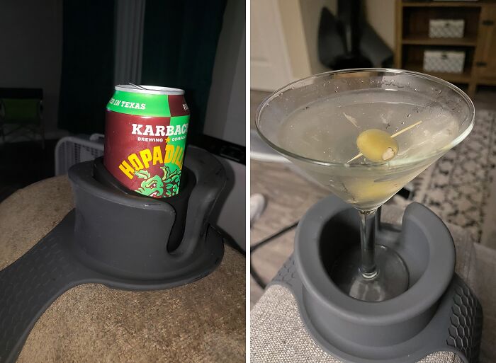 Revisar: «¡Me encanta este portavasos! Es justo lo que necesitábamos para una silla que se sienta sola sin una mesa cerca. ¡Permanece en el brazo y no se mueve! Tener la pieza central removible es excelente y se adapta a diferentes tamaños de tazas, tazas y botellas». -Paula