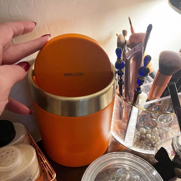 Revisar: «Me encanta mi pequeño bote de basura. La tapa se gira para que sea más fácil tirar cosas en él. Cosas como mis almohadillas de maquillaje, hisopos, toallitas limpiadoras. Cosas pequeñas». -Victoria M.