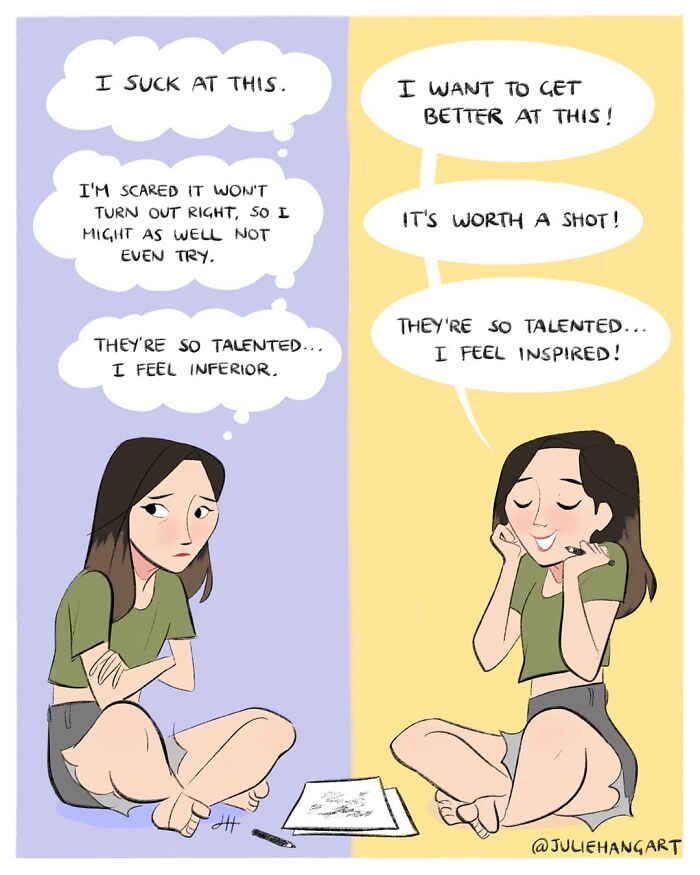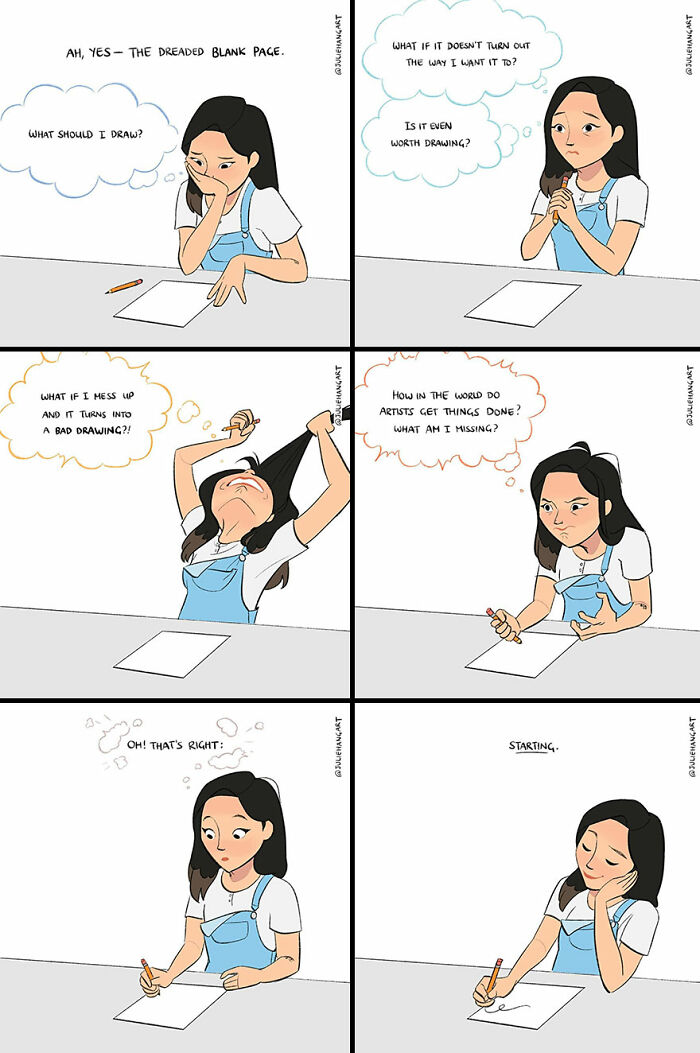 panda aburrido Me comuniqué con Julie Hang para hacerle algunas preguntas sobre su trabajo reciente. En su sitio web, la artista afirma que «espera hacer del mundo un lugar mejor, un garabato edificante a la vez». Es por eso que queríamos que Julie compartiera más detalles sobre su trayectoria como artista de desarrollo visual y cómo encontró su pasión por los garabatos edificantes. Aprendimos que: «Siempre me ha encantado dibujar. Asistí a la escuela de arte con la esperanza de algún día tener una carrera en películas animadas y programas de televisión. Después de graduarme, trabajé como diseñador de movimiento durante 4 años antes de hacer la transición a artista de desarrollo visual. Mientras trabajaba en mi portafolio, comencé a hacer cómics sobre temas de autocompasión, lo que me llevó a descubrir que realmente disfrutaba hacer arte que hiciera que las personas se sintieran bien consigo mismas o tuvieran una mejor perspectiva de sus vidas. Con el tiempo, mi obra de arte se transformó en ilustraciones. que capturan una sensación de alegría y aprecio por las pequeñas alegrías de la vida”.