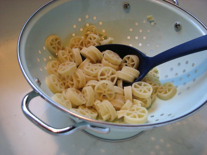 Usé un colador para colar mis linguini, pero los agujeros eran más grandes que la pasta, por lo que todo se atravesó y cayó al fregadero.