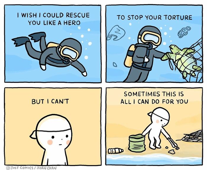 Y los que sufren las consecuencias de esto no son sólo los propios humanos, sino también los animales. Para concienciar sobre el estado de nuestro planeta y sus habitantes, Joan Chan, un dibujante de cómics de Hong Kong de 32 años, inició una serie de cómics llamada «Just Comics».