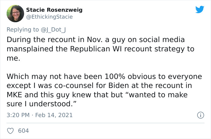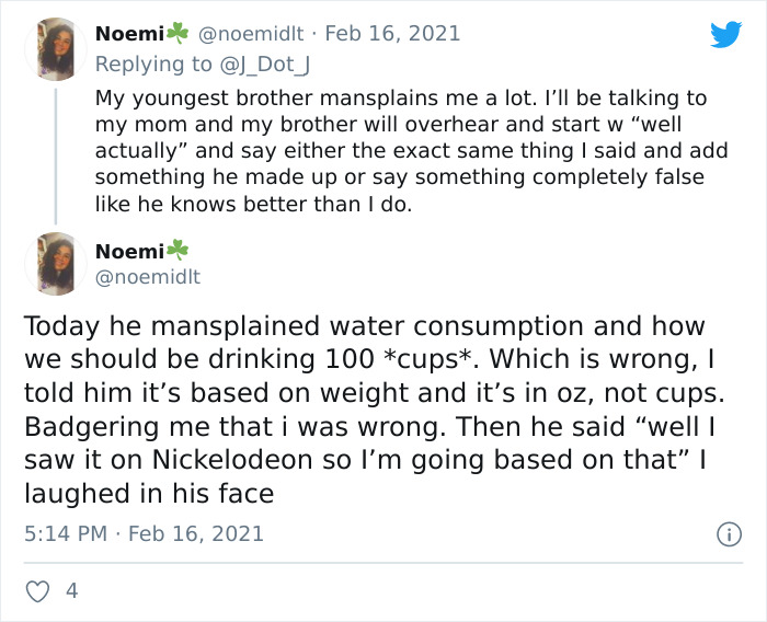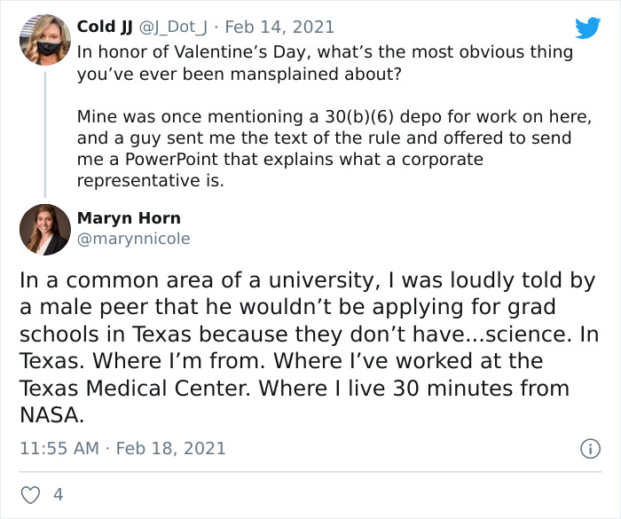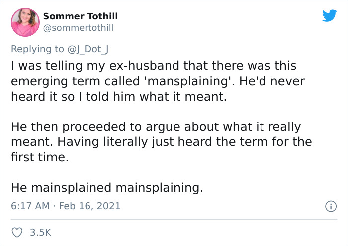 En celebración del reciente Día de San Valentín, el usuario de Twitter @J_Dot_J preguntó la gente ¿Qué fue lo más obvio que se les explicó? Docenas y docenas de personas compartieron sus mejores historias de mansplaining, no solo expresando sus frustraciones, sino también señalando que nadie debería asumir que no sabes cosas.