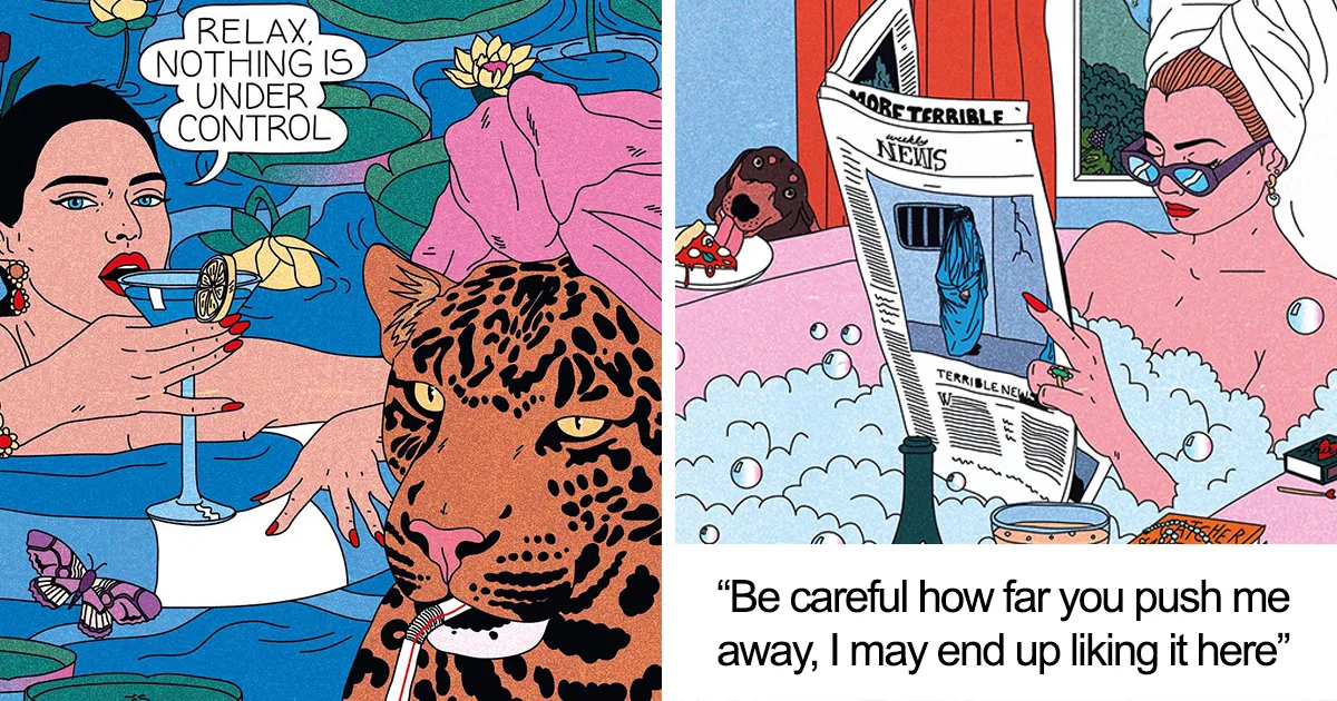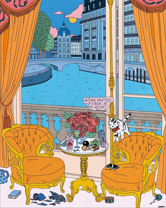 Una ilustradora francesa llamada Cosmo nos llamó la atención con su obra de arte detallada y vibrante, que, muchas veces, presenta a mujeres en diversos escenarios hermosos acompañados de mensajes sarcásticos.