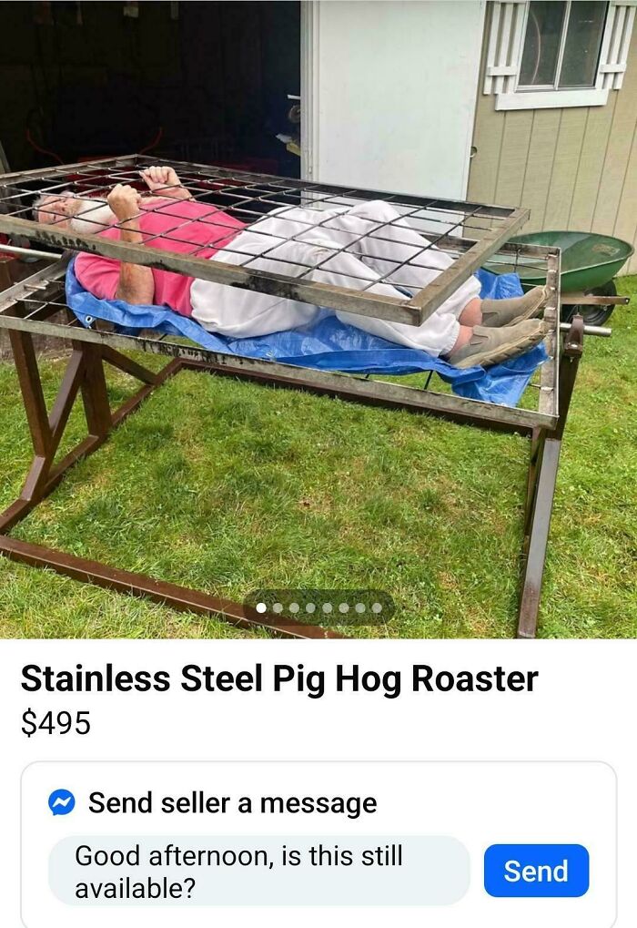 Encontré esta publicación y supe que necesitaba compartirla con alguien. Esto está a la venta en el mercado. Es un marco para atar un cerdo para cocinar. Supongo que alguien tenía que demostrarlo.