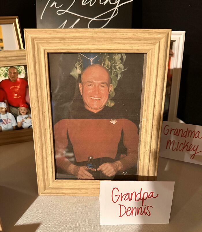 Mi abuelo se vistió de rojo intenso para una fiesta del año 2000. Hace poco mi prima se casó y tenían una mesa con fotografías de invitados que sólo podían asistir en espíritu. Mi abuelo falleció cuando yo era muy joven y solo comencé a hacer caminatas hace unos 5 años. Unos años después, mi papá me dijo que mi abuelo era un trekkie. No hace falta decir que ver esto definitivamente me hizo llorar. Sin embargo, la insignia de comunicación al revés es muy graciosa, creo que definitivamente estaba bebiendo algo de verde esa noche.