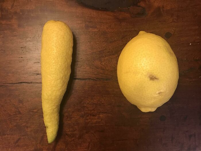 #23 Mi mamá encontró un limón de nuestro árbol que tiene forma de zanahoria. Limón normal para comparar