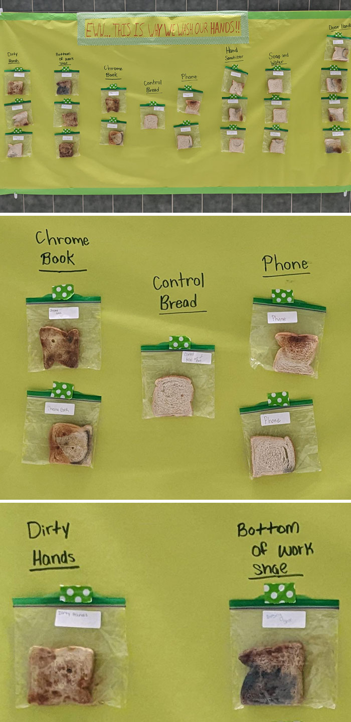 #34 La clase de salud de nuestra escuela secundaria tiene una exhibición de pan mohoso en la pared para mostrar cómo debemos lavarnos las manos y los teléfonos
