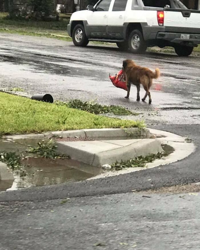 #4 El perro lleva una bolsa entera de comida para perros después del huracán Harvey