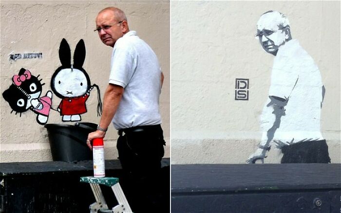 #28 DS Bad Kitty Graffiti eliminado y luego el trabajador que lo eliminó reaparece en su lugar. Islington, Londres, Reino Unido [620×387]