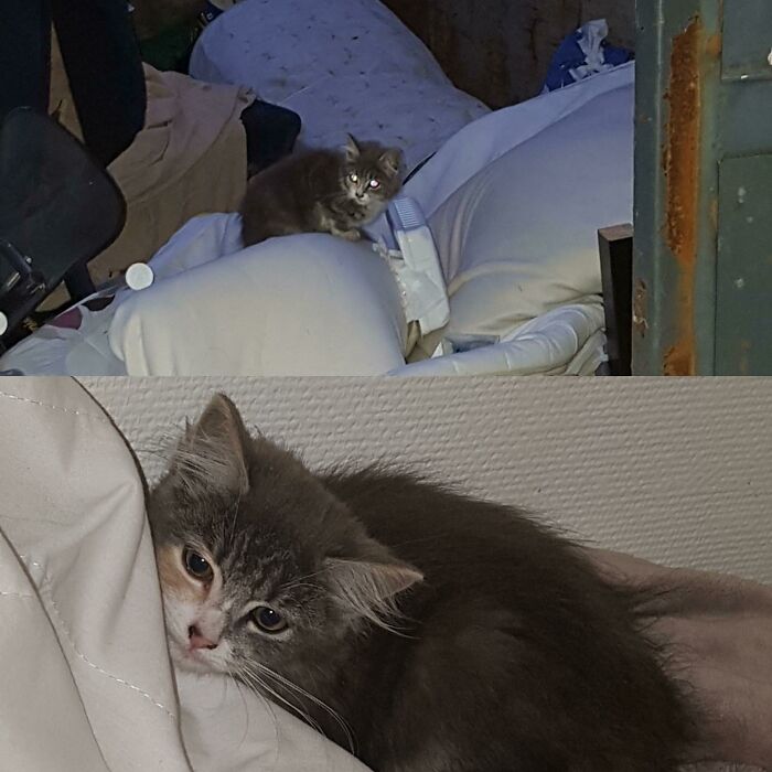 # 6 Cuando salí a bucear en el contenedor de basura y jugar Pokémon Go anoche y encontré a esta pequeña monada. La acogió y publicó sobre ella en «Lost Pets» en Facebook. Después de haber estado desaparecida durante 2 semanas, finalmente regresó a casa con sus padres y solo tenía 3 meses.