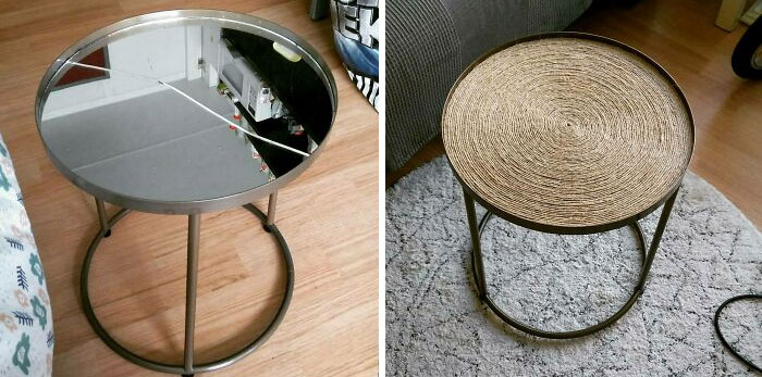 # 18 Conseguí esta mesa auxiliar de la acera. Su parte superior estaba rota, así que dediqué un poco más de 3 horas y 4 € en cuerda y pegamento para reciclarlo.