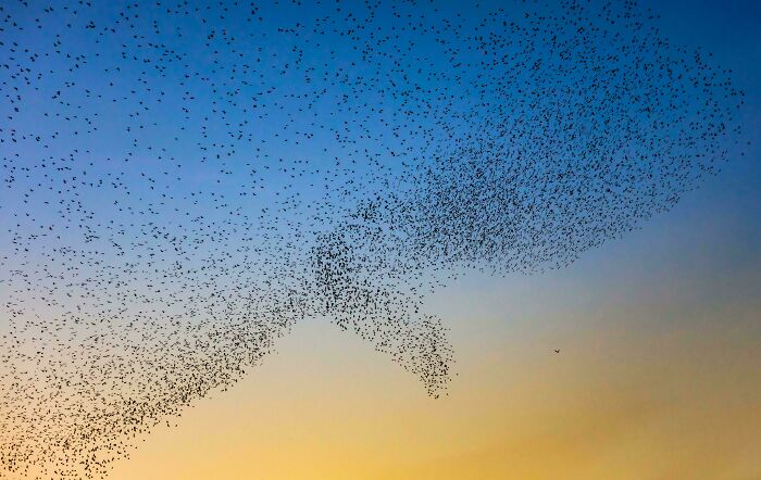 6 años después del día en que estaba fotografiando esta enorme masa de aves. Tomé unas 300 imágenes y durante una fracción de segundo formaron esta forma. Esta semana vi la nube formando la forma del pájaro en Reddit, lo cual es increíble, así que pensé en publicar esto. ¿Cuáles son las probabilidades?