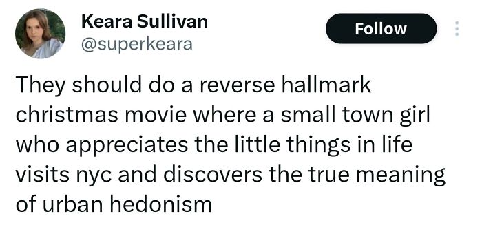 #55 «Deberían hacer una película navideña invertida donde una chica de pueblo que aprecia las pequeñas cosas de la vida visita Nueva York y descubre el verdadero significado del hedonismo urbano»