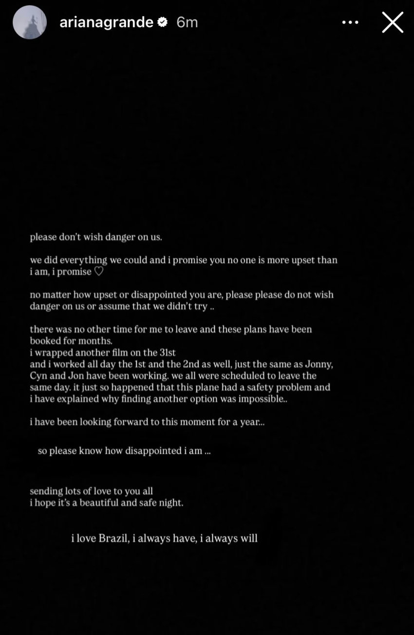 «He estado esperando este momento durante un año», continuó Grande en la historia de Instagram, «así que sepan lo decepcionada que estoy. Les envío mucho amor a todos. Espero que sea una noche hermosa y segura. Amo Brasil, siempre lo he hecho y siempre lo haré».