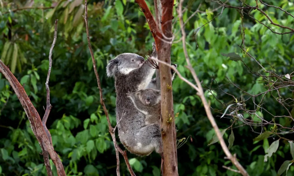 Un Koala y Joey suben un árbol en los matorrales ubicados cerca del centro de Brisbane el 14 de diciembre de 2024. David Gray/AFP a través...