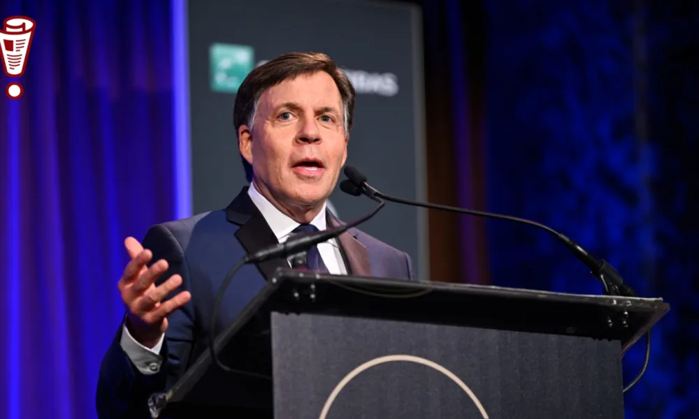 Bob Costas habla en el escenario durante el baile de leyendas del Salón de la Fama del Tenis Internacional en Cipriani 42nd Street el 10 de...