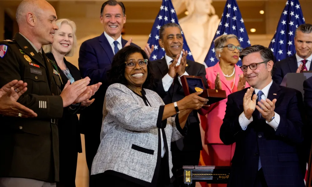 El presidente de la Casa, Mike Johnson, republicano de La-La., Presenta a Debra Willett, la nieta del sargento Harlem Hellfighter. Leander Willett, con la medalla de...