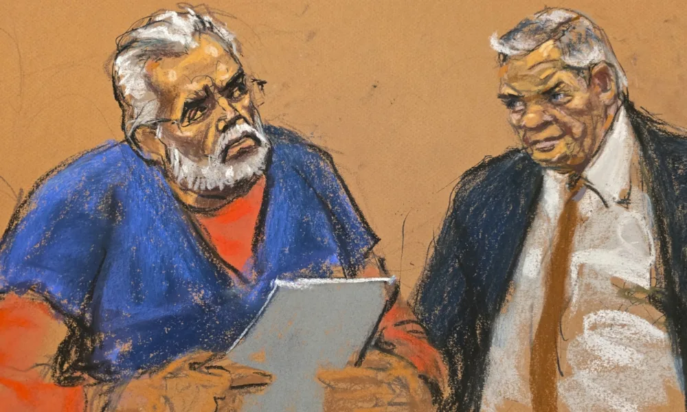 «El Mayo» Zambada habla con el juez Brian Cogan (no en la foto) en el Tribunal Federal de Brooklyn, mientras su abogado defensor Frank Pérez mira...