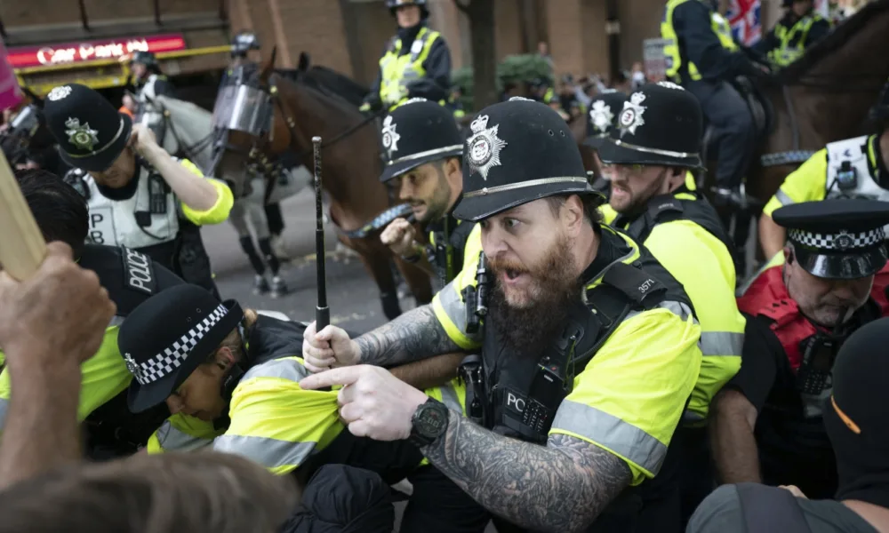 Los oficiales de policía montados se pelean con manifestantes durante una protesta por el sistema antimigrante de asilo y contrats en Castle Park en Bristol, Inglaterra,...