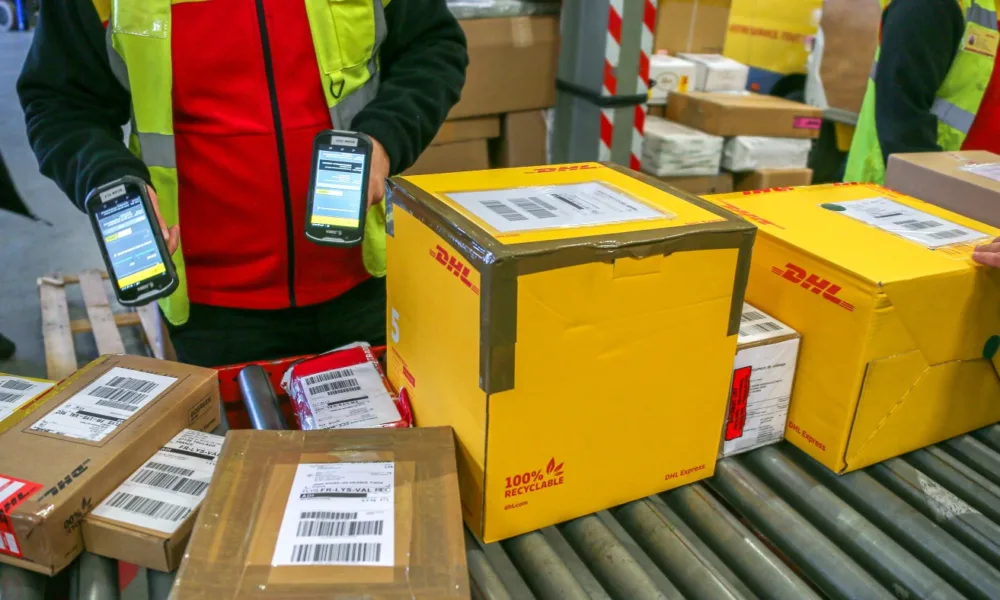 Un trabajador de almacén utiliza un escáner para identificar cartones de parcelas de bienes en una cinta transportadora en un hangar en la distribución de paquetes...