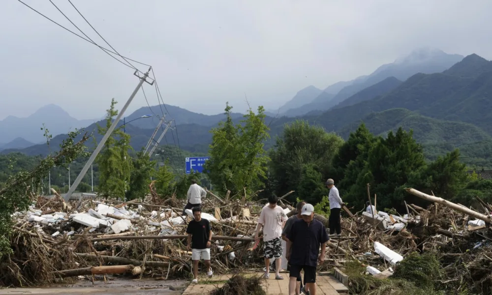 Los residentes locales caminan frente a una carretera dañada llena de ramas de árboles rotas después de una fuerte lluvia en la ciudad de Taishitun, distrito...