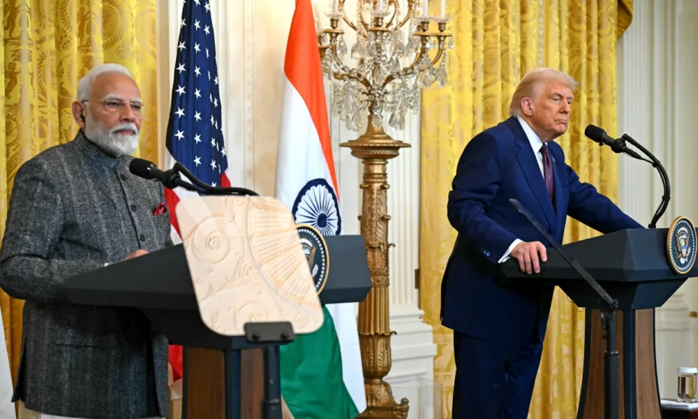 El presidente Trump y el primer ministro indio, Narendra Modi, celebran una conferencia de prensa conjunta en la sala este de la Casa Blanca el 13...