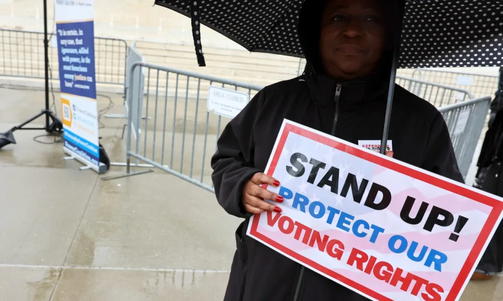 Un manifestante posee un paraguas y un letrero que dice «¡Levántate! Proteja nuestros derechos de voto» fuera de la Corte Suprema de los Estados Unidos en...