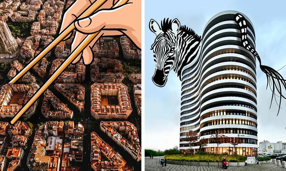 Robin Yayla observa monumentos famosos y lugares cotidianos y los imagina de manera diferente. Agrega personajes populares, alimentos gigantes o dibujos divertidos que se mezclan perfectamente...