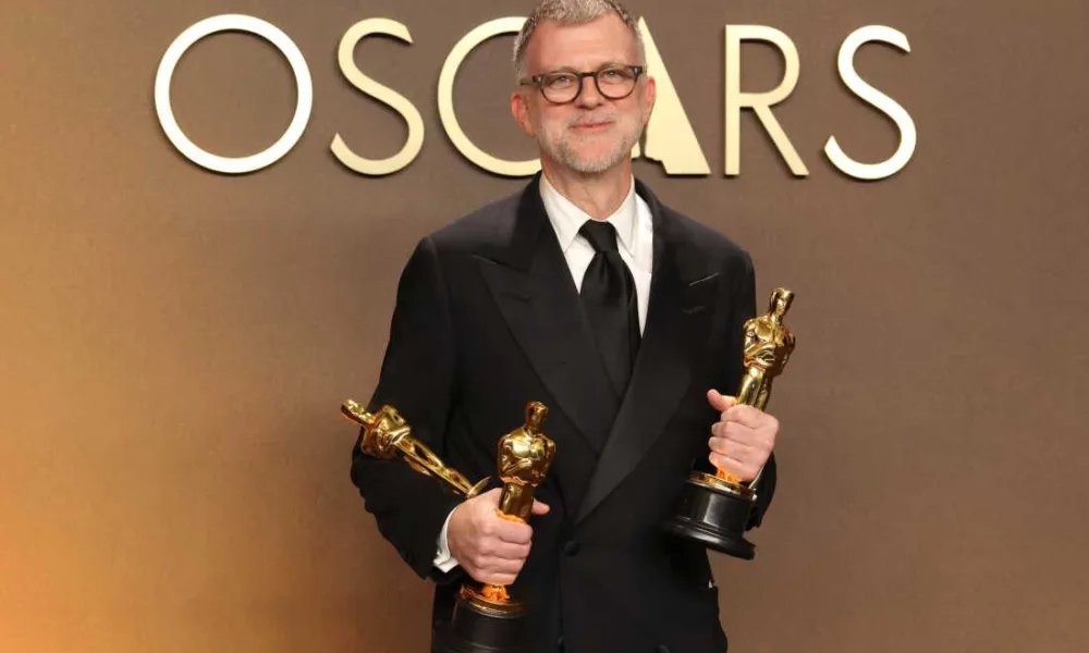 Paul Thomas Anderson celebra sus premios Oscar al mejor guión adaptado, mejor director y mejor película por Una batalla tras otra. Mike Coppola/Getty Images ocultar título...