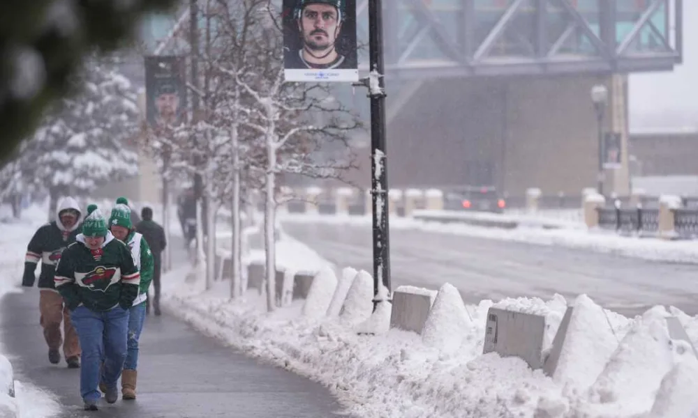 Los fanáticos caminan por calles nevadas antes de un partido de hockey de la NHL entre los Minnesota Wild y los Toronto Maple Leafs, el domingo...