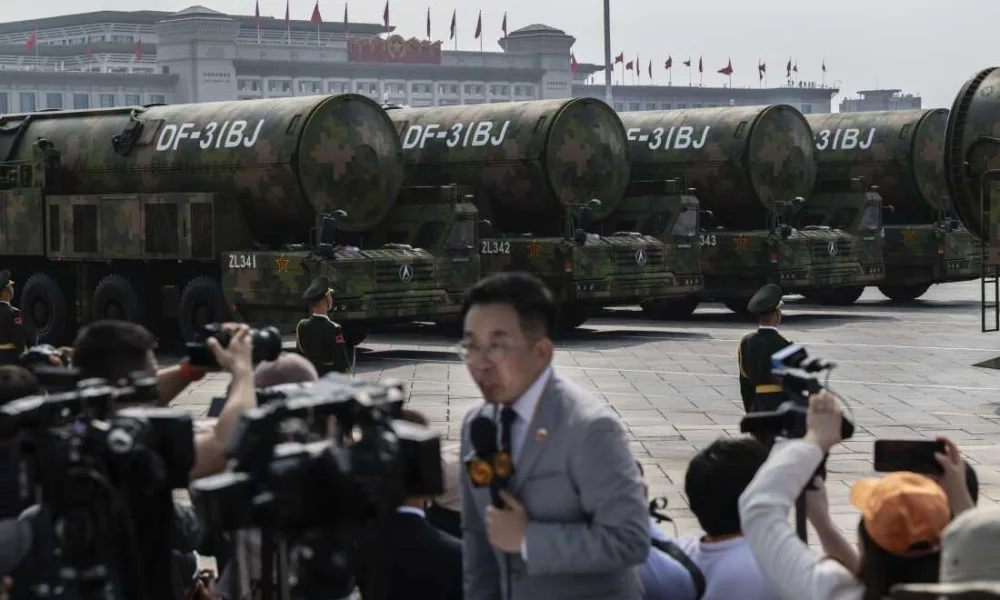 Misiles balísticos DF-31BJ con capacidad nuclear se muestran en transportadores durante un desfile militar en Beijing, China, el 3 de septiembre de 2025. China está experimentando...