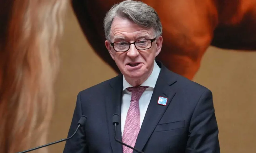 El entonces embajador británico en Estados Unidos, Peter Mandelson, habla durante la ceremonia de rededicación de la estatua de George Washington en la Galería Nacional de...