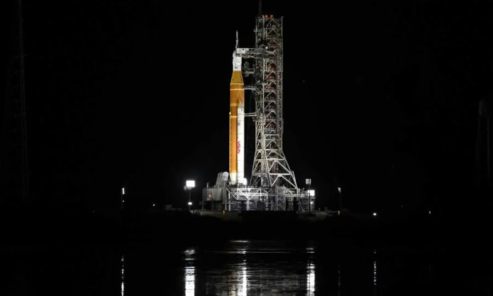 El cohete Space Launch System (SLS) y la nave espacial Orion se ven en el Centro Espacial Kennedy en Cabo Cañaveral, Florida, el domingo. Miguel J....