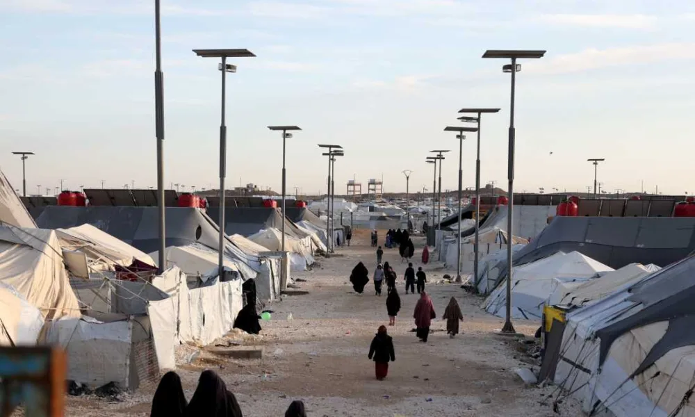 Mujeres y niños, familiares de presuntos combatientes del Estado Islámico, se sientan cerca de un muro dentro del campamento de al-Hol en la región desértica de...