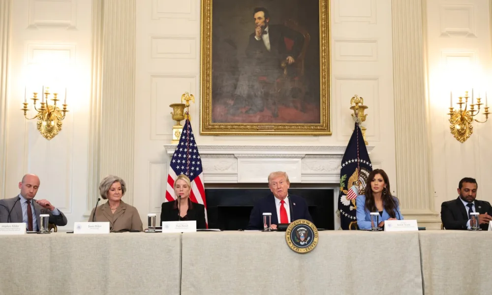 El presidente Trump habla mientras (LR), el subjefe de gabinete de la Casa Blanca, Stephen Miller, la jefa de gabinete de la Casa Blanca, Susie Wiles,...
