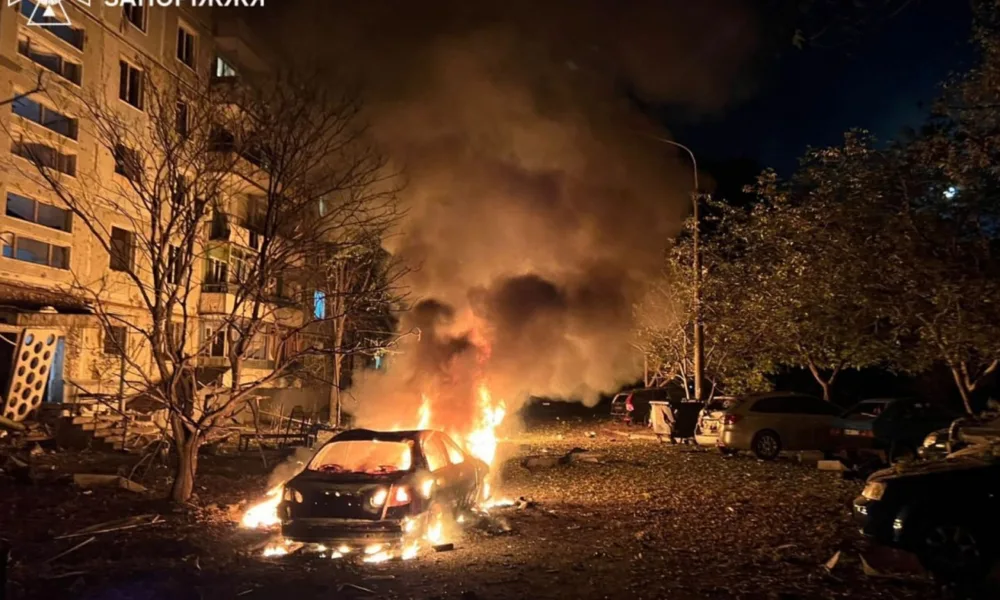 En esta foto proporcionada por el Servicio de Emergencia de Ucrania, aumenta el incendio y el humo después de que un edificio residencial fue dañado durante...