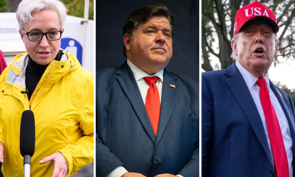 Desde la izquierda: la gobernadora de Oregon, Tina Kotek, gobernador de Illinois, JB Pritzker, presidente Trump. Tanto Oregon como Illinois están demandando a la administración Trump...