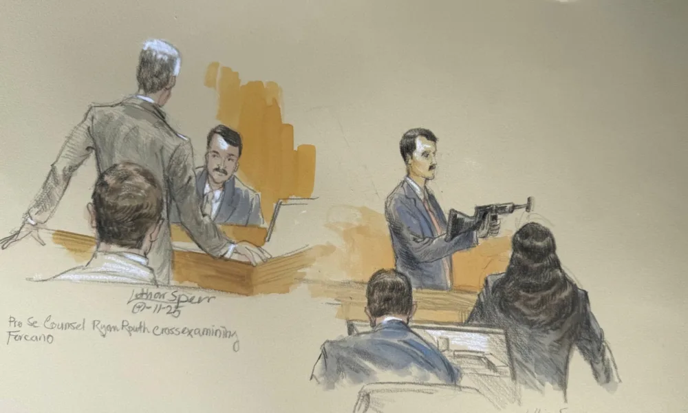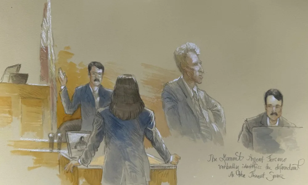 Este boceto de la corte muestra al agente del Servicio Secreto Robert Fercano identificando al acusado el 11 de septiembre de 2025 en el juicio de...