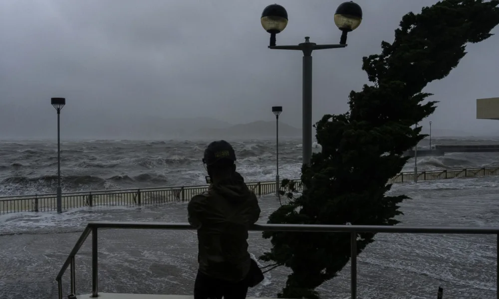 Las fuertes olas se estrellaron contra la costa en el área de Heng Fa Chuen cuando se acerca el súper tifón Ragasa en Hong Kong, el...