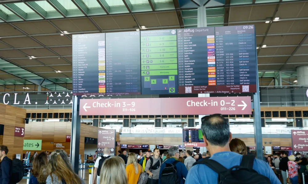 Las personas en el aeropuerto de Ber como ataque cibernético han causado demoras, en Berlín, Alemania, el sábado. Carsten Koall/DPA a través de AP escondite alternar...