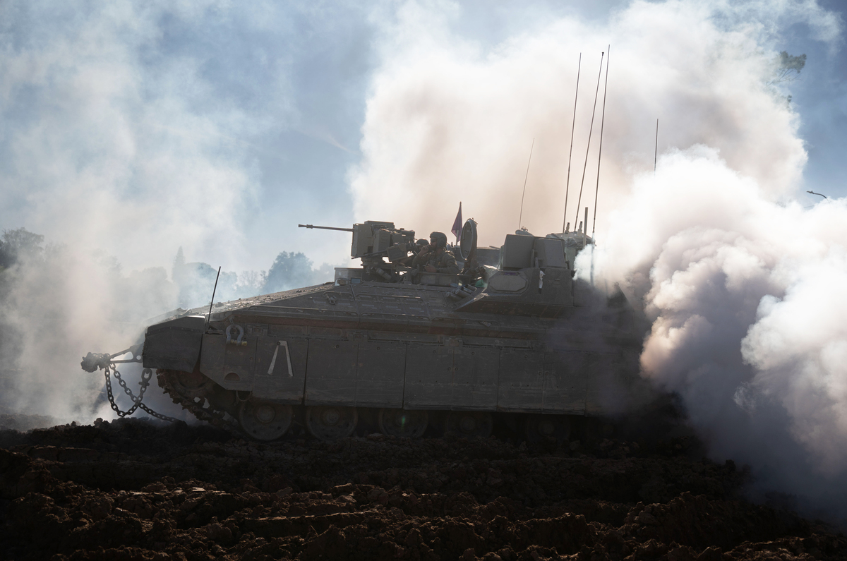 Soldados israelíes desempacan sus tanques y vehículos blindados para cargarlos en camiones, después de regresar de Gaza en la frontera de Gaza, Israel, el 29 de febrero.
