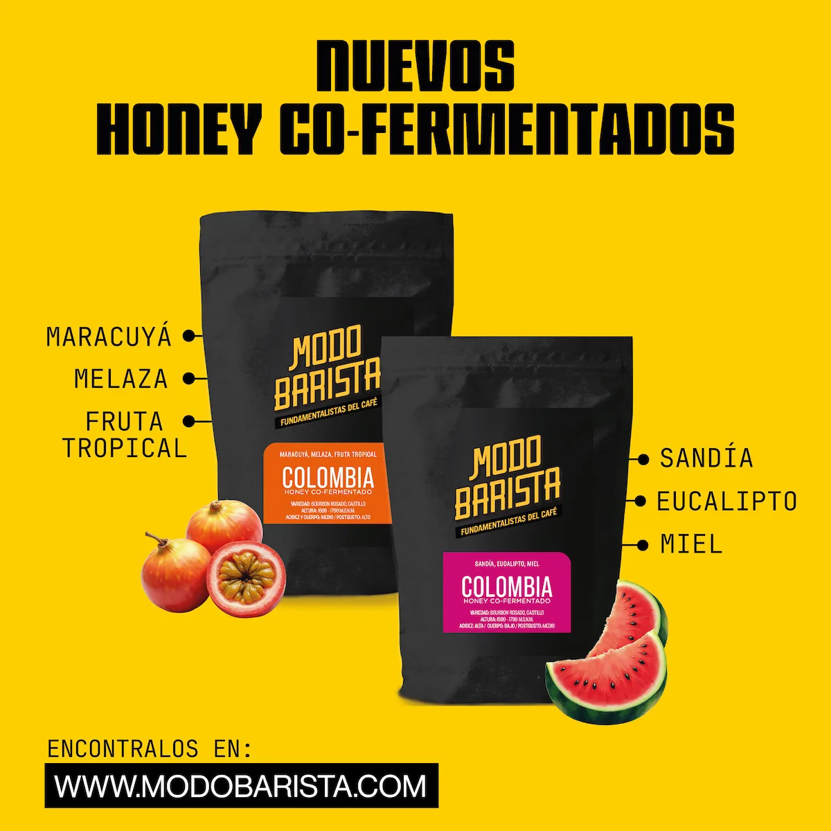 Sempre a la cabeza de la novedad cafetera, Modo barista presenta sus nuevos cafés colombianos Miel co-fermentados. ¿Y eso? Los cafés tienen una combinación del proceso Miel con frutas deshidratadas osmóticamente y esto crea un ambiente muy rico en azúcares y aromas, lo que impulsa una fermentación más intensa y llena de sabores. Este método potencia las notas frutales y el dulzor natural del café. El resultado: una taza más expresiva y compleja. Es ideal para métodos de filtrado. Hay dos versiones. el Colombia Miel cofermentada Maracuyá es de las variedades Borbón Rosado y Castillo cultivadas en Huila y Quindío, con acidez baja, cuerpo y posgusto medios y notas a maracuyá, melaza y fruta tropical. el Colombia Miel cofermentada Sandía es de las mismas variedades y zona, pero tiene acidez alta, cuerpo bajo y posgusto medio, con notas a sandía, eucalipto y miel. ¡Una ensalada de frutas en la taza!