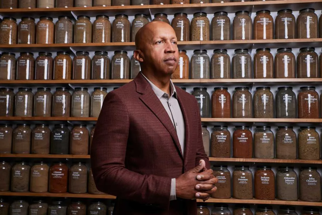 Bryan Stevenson está junto a frascos que contienen tierra recolectada de los lugares donde fueron linchados los negros. Es el fundador de Equal Justice Initiative y el autor de Misericordia Justa: Una Historia de Justicia y Redención.