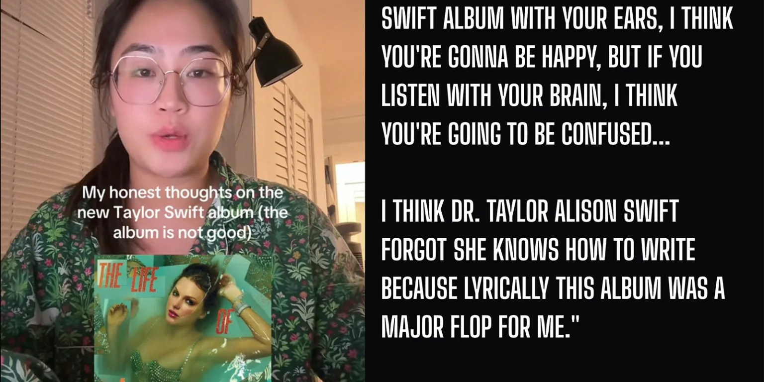 Los fanáticos acudieron en masa a las secciones de comentarios de sus plataformas preferidas para el lanzamiento de la medianoche, y aunque el éxtasis inicial del fervor religioso Swiftie aparentemente se ha disipado, las tomas calientes aún se están fortaleciendo. Un creador de Tiktok, Simone, que usa el mango @balloonbreath, dio una de las críticas más impresionantes que hemos visto hasta ahora, cortando directamente en el pop de burbuja de todo,