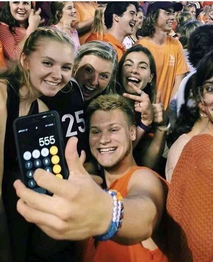 Lo que podemos saber es su contenido: imágenes que van desde levemente inusuales hasta completamente extrañas. Por un lado, tenemos fotos de gente proyectando una película sobre una vaca porque, por supuesto, un árbol no la va a cortar, y este muchacho trolleando a un trío de mujeres que piensan que se están tomando una selfie, pero él simplemente está tocando el 5 para simular la pulsación de un botón.