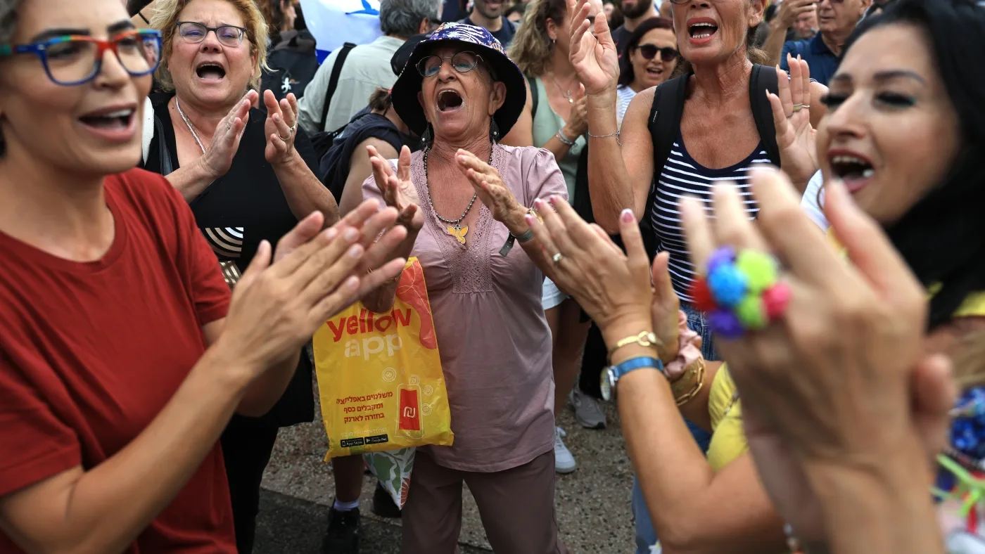 Los israelíes celebran mientras reaccionan a la noticia del acuerdo de paz de Gaza en la Plaza de los Rehenes el jueves en Tel Aviv, Israel.